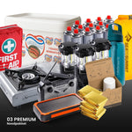Das Noodpakket Premium ist unser umfassendstes Set und enthält neben allen Artikeln aus dem Pro-Paket zusätzliche Ausstattungen für langanhaltende Notfälle, wie zum Beispiel eine Notration und einen Wasserfilter, den Sie an den Wasserhahn anschließen können.